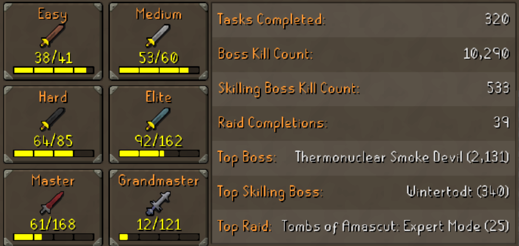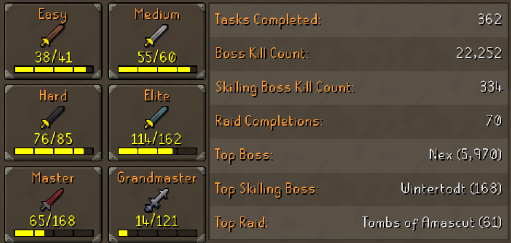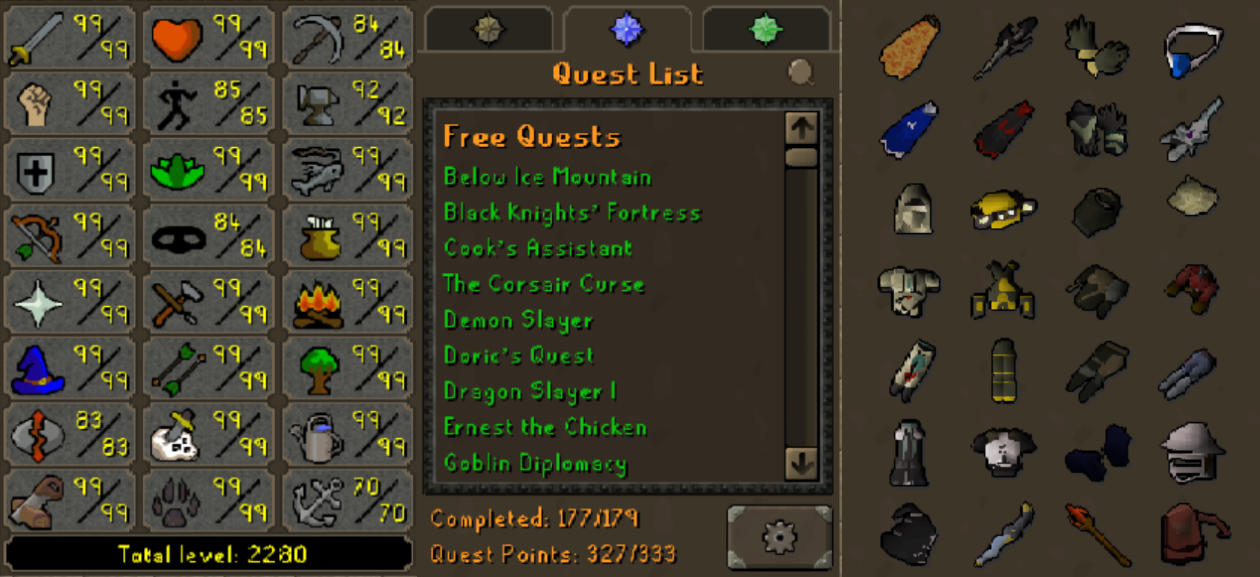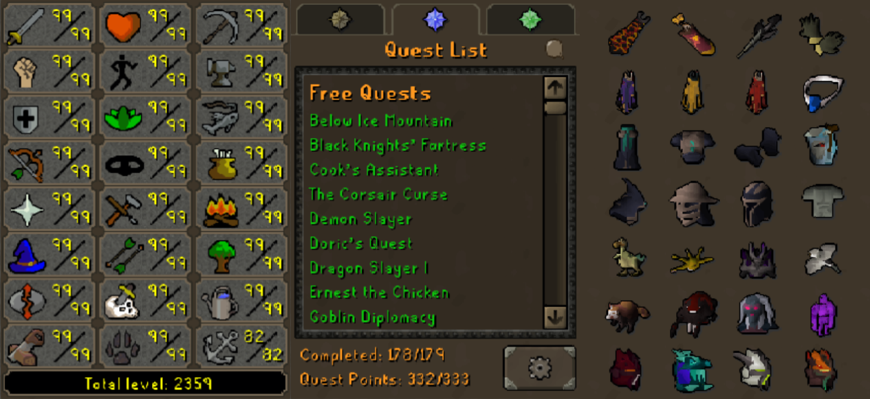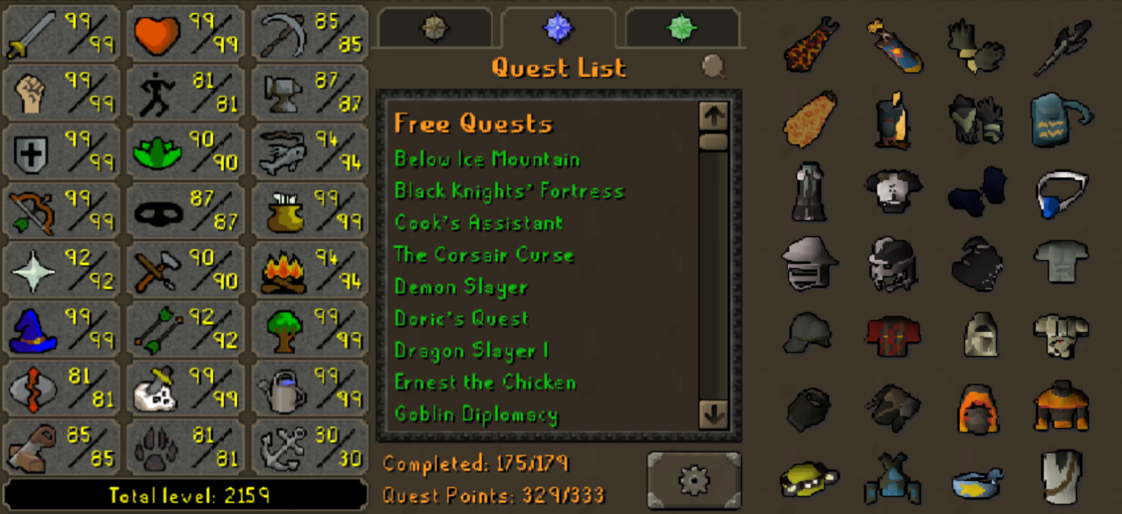 Main | 2190+ Total | 300+ QP | 99 Attack | 99 Strength | 99 Ranged | 99 Magic | Infernal | Quiver | Avernic | E Void | Assembler | B Gloves | MA2 Cape | Skilling Outfits | Rare Pet